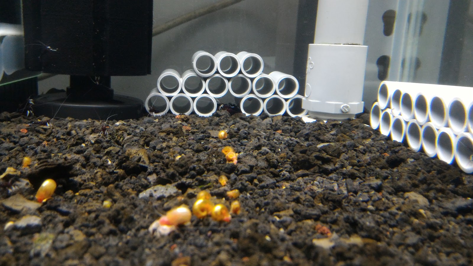 將舊系統缸的水管拆下來後,將好的部分在回收利用成蝦屋,製作方式很簡單,用水管剪將水管裁切成適當長度,接著用硬質膠合劑(俗稱水管膠)去拼奏黏成需要的組合。這邊的建議是黏合後將多餘部分擦拭掉,在用橡皮圈綁住在立起來放一陣子去風乾,外表就會乾乾淨淨。通常我製作完的也不會馬上下水,我習慣用個水桶來泡水幾天後才會正式使用。