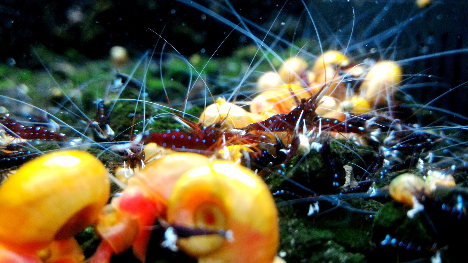 初期和螺類混養,也能提高存活率。原因是什麼呢?我也不知道呢~可能螺消化不全的便便,可以提供牠們一點點的營養吧!可是,牠們還是有競爭關係,所以螺一多蝦就少。不過螺類還有個優點就是會替我清潔魚缸呢~