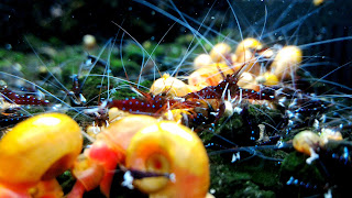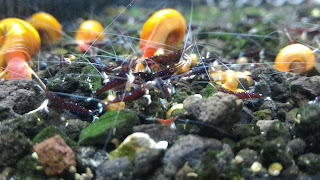 初期和螺類混養,也能提高存活率。原因是什麼呢?我也不知道呢可能螺消化不全的便便,可以提供牠們一點點的營養吧!可是,牠們還是有競爭關係,所以螺一多蝦就少。不過螺類還有個優點就是會替我清潔魚缸呢