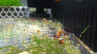 蘇蝦適應後約1個月開始有慢慢繁殖,水草則除了長的慢以外,看起來似乎沒大礙(種類要挑選一下)。這幾個月看來,裸缸育成率只能說還可以。也許還是接近天然擺設對蝦的壓力最小......也比較好看。